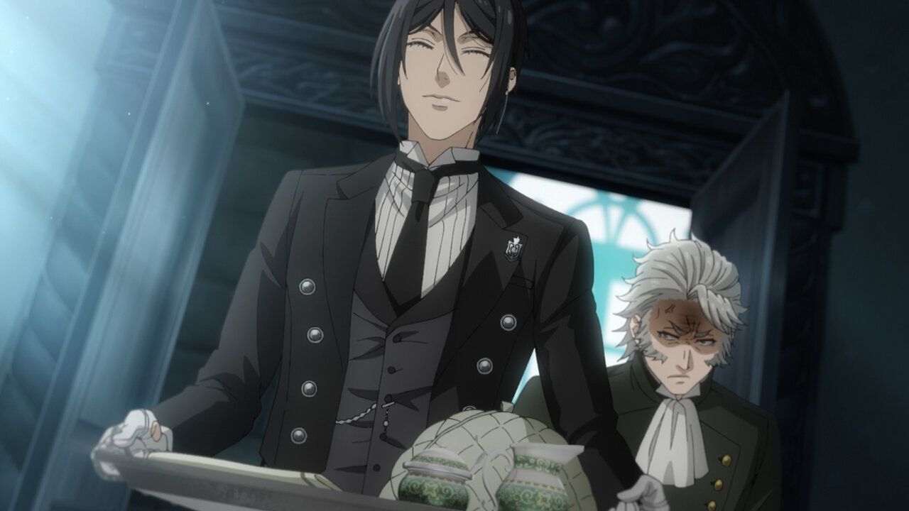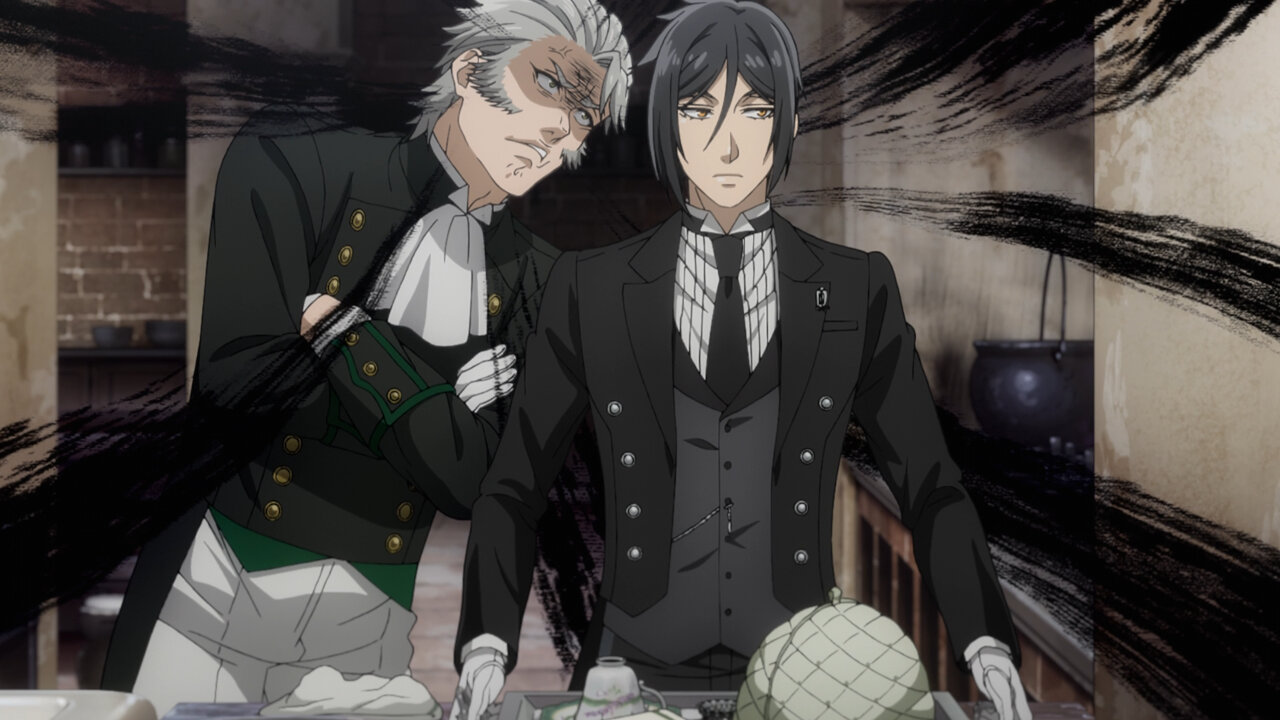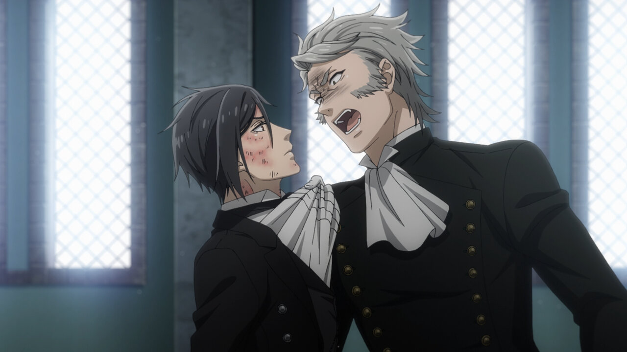 It’s definitely an interesting turn of events, seeing Sebastian have to beg for something, coming face to face with his own limitations. Which, who knew demons had those? Sebastian vows to follow any order of Sullivan’s in payment for curing Ciel. That’s not something to be taken lightly, given where that child’s mind goes. Her request is surprisingly innocent, but wise on her part- have Sebastian teach her about the outside world and teach Wolfram how to be a better butler, something which seriously grates on Wolfram.