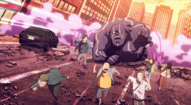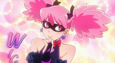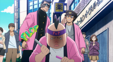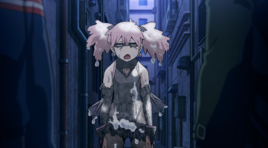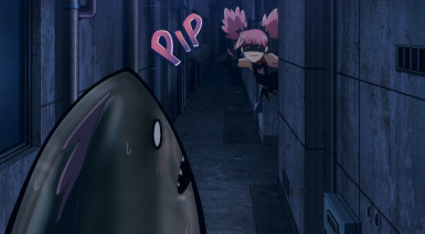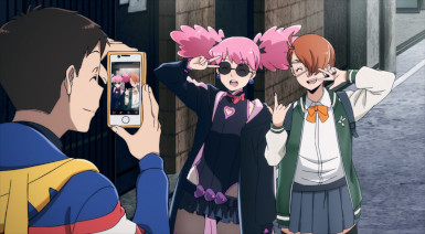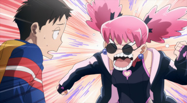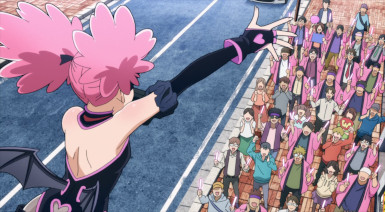 Kouchi and the two middle-schoolers hatch a plan to see if Teru (released as a zaku by the cops) to tell her who his source is. They decide it’d be best not to bring “punch first, let the cops sort ’em out” Knuckleduster in on it. But the chaos prevents the plan from ever coming off, and Teru is seen in the company of another high school girl named Hachisuka Kuin (Senbongi Sayaka). We know a little about her – she’s a Pop fangirl, and describes herself (to herself) as a “part-time villain”. And she has an affinity for bees – bees intimately involved in the spread of Trigger, it seems.