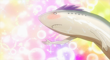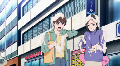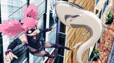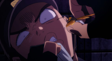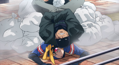 Even for these humble folks, however, duty is always one crisis away. The crisis in this case being another instant villain courtesy of Trigger. This time is a meek little fellow named Teru (Kamiki Kouichi), desperate to shake Pop’s hand. Tired of being pushed around by the toughs in the crowd, Teru pops some Trigger. And apparently his quirk is something in the eel vein, because he turns into a giant one. This gets uncomfortable for Pop very quickly, but fortunately Koucihi is in the area and Knuckleduster soon follows. That’s not to say fighting a giant eel is easy – they’re slimy bastards. But after a handshake proves insufficient to satisfy this one, Knuckle and The Crawler have to resort to udon flour to make Teru a little less hard to handle.