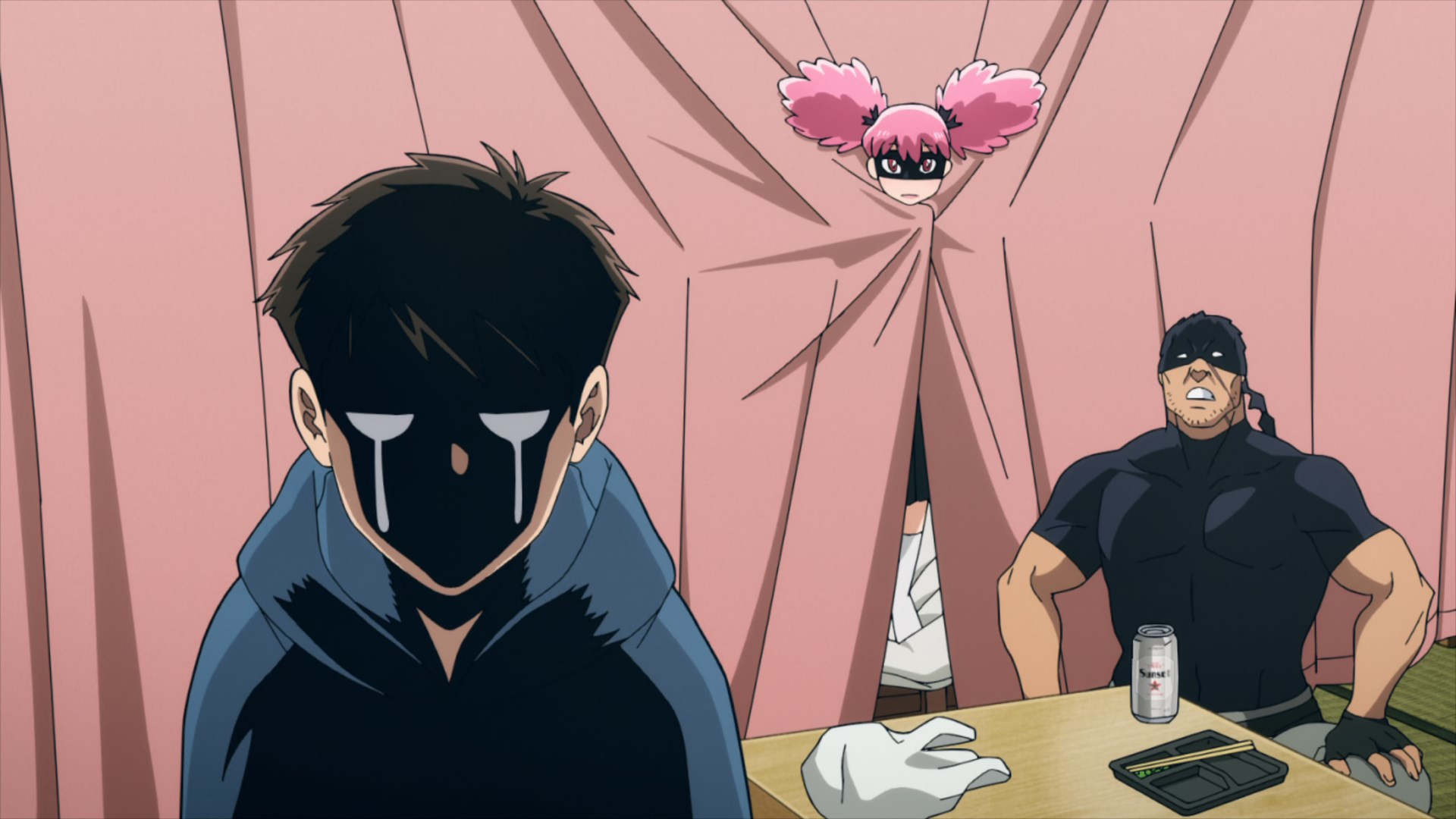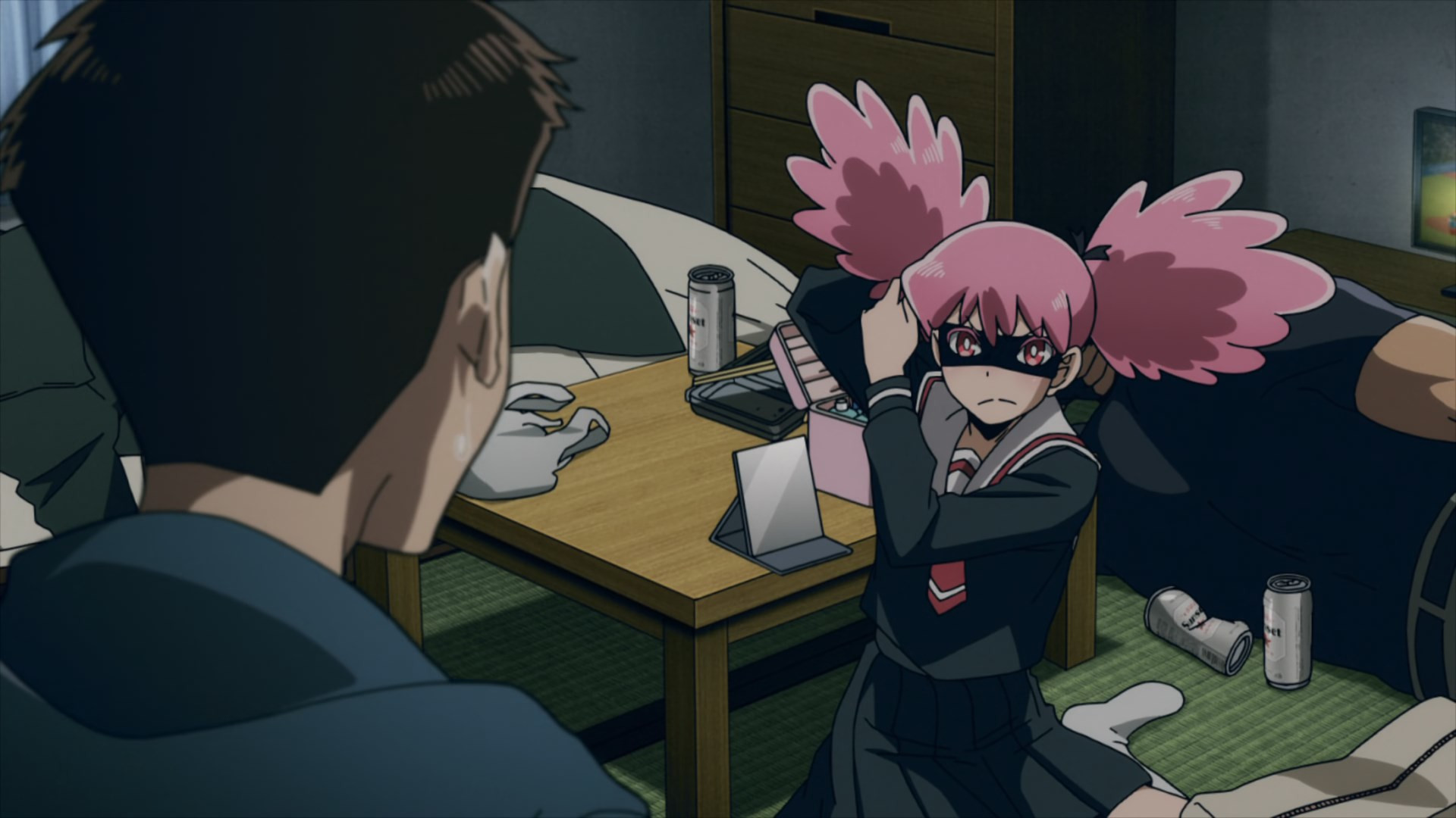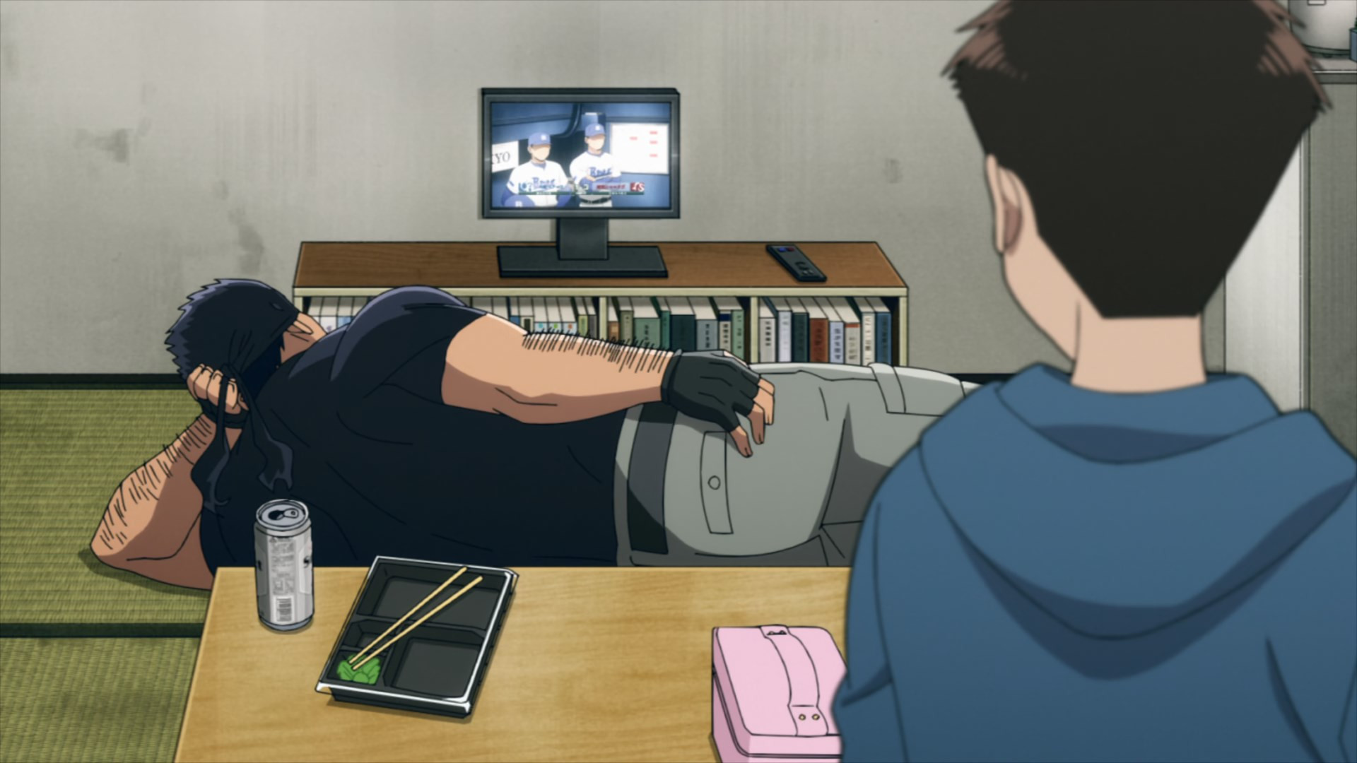 It doesn’t get much more mundane than the opening salvo this week, even by Illegals standards. A college freshman’s life is likely to be pretty unglamorous to begin with. But that feels like a dream to Kouichi, who’s done none of the partying and socializing he dreamed he’d indulge in. Instead he’s living in a shack, and comes home to find a smelly oji-san smaking himself at home in it. After an initial freakout Kouichi realizes that this is in fact Knuckleduster – arrived early after finishing his day job (no clues as to what that is are forthcoming), and helping himself to Kouichi’s meager provender.