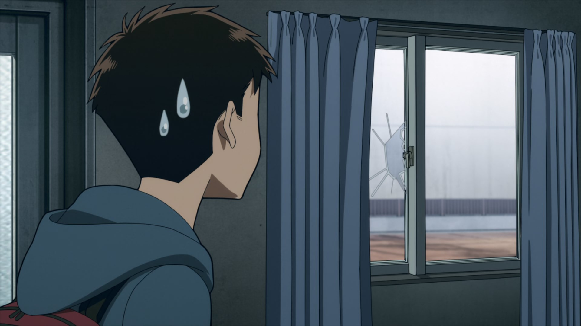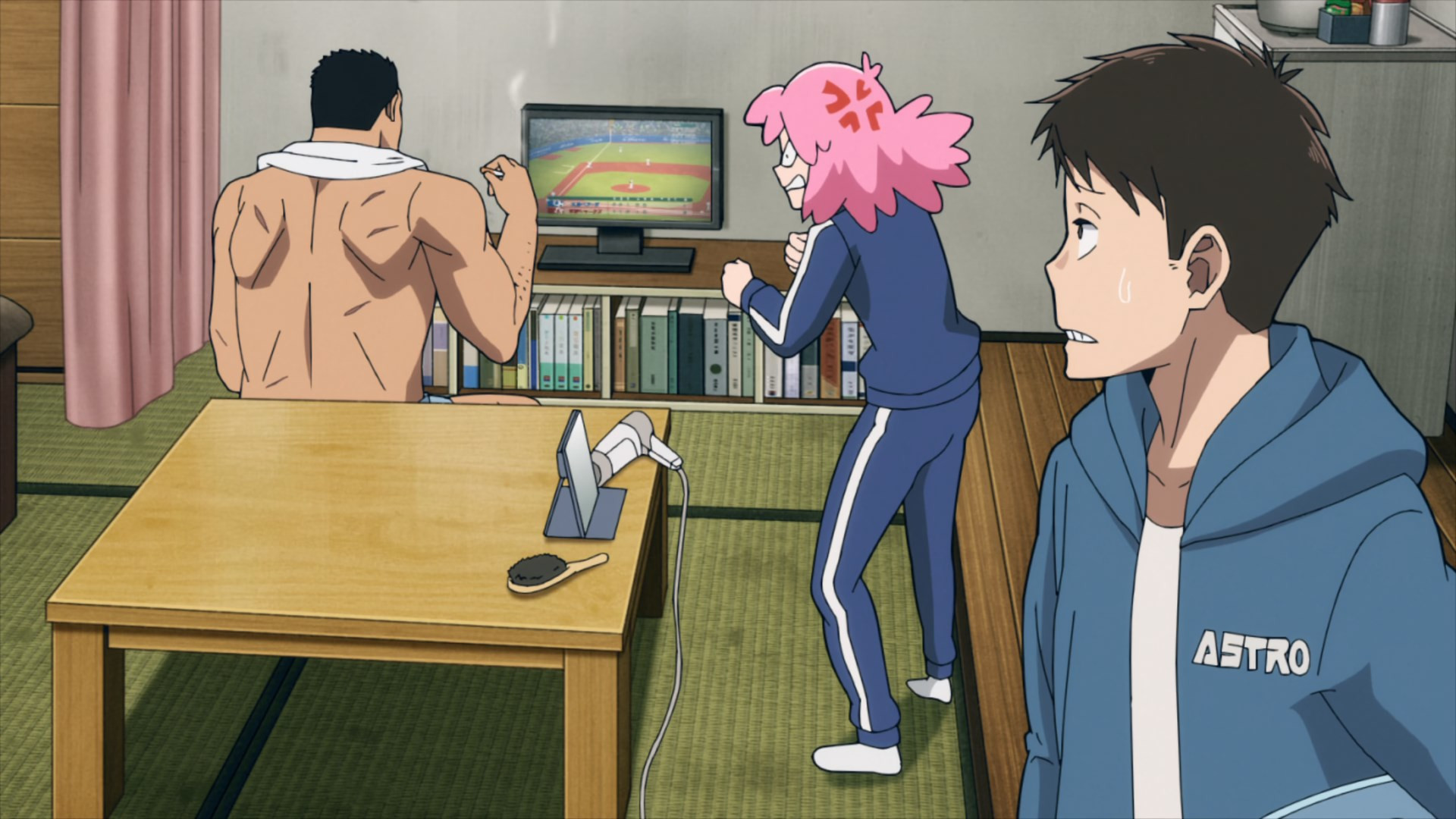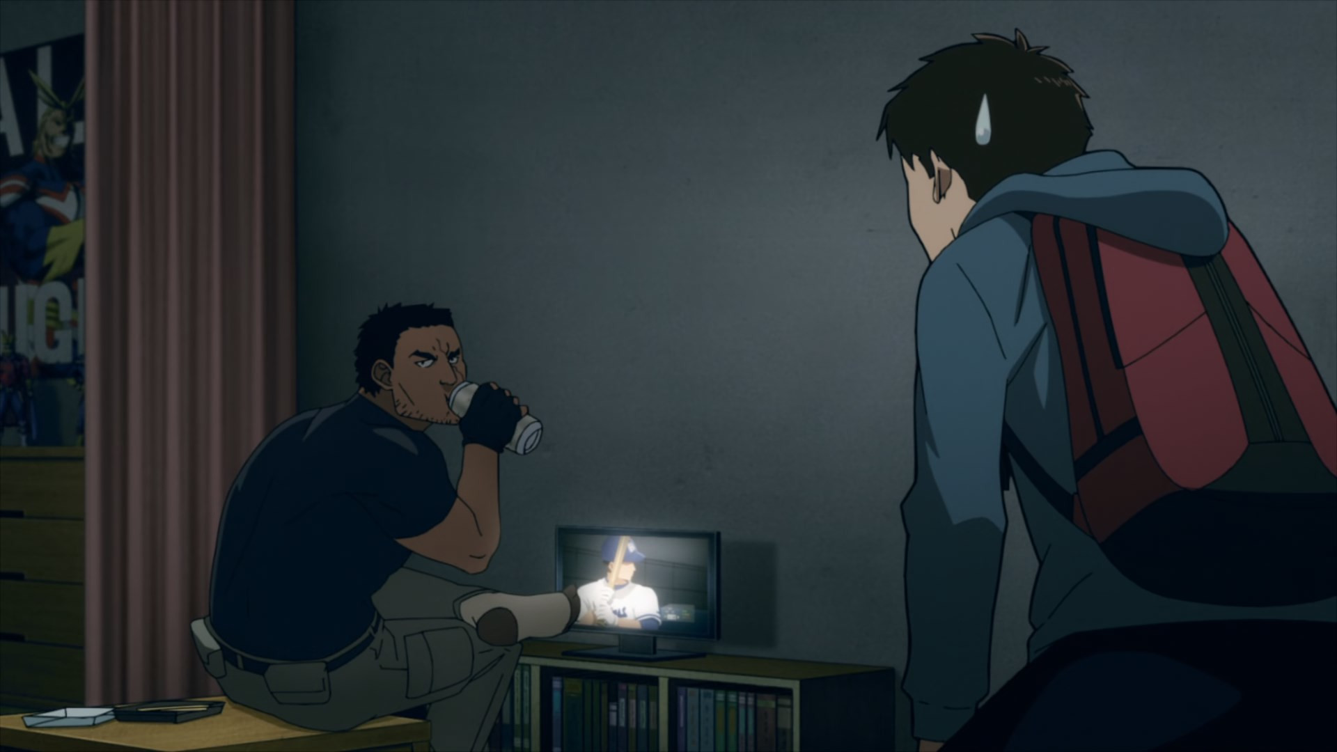 It doesn’t get much more mundane than the opening salvo this week, even by Illegals standards. A college freshman’s life is likely to be pretty unglamorous to begin with. But that feels like a dream to Kouichi, who’s done none of the partying and socializing he dreamed he’d indulge in. Instead he’s living in a shack, and comes home to find a smelly oji-san smaking himself at home in it. After an initial freakout Kouichi realizes that this is in fact Knuckleduster – arrived early after finishing his day job (no clues as to what that is are forthcoming), and helping himself to Kouichi’s meager provender.