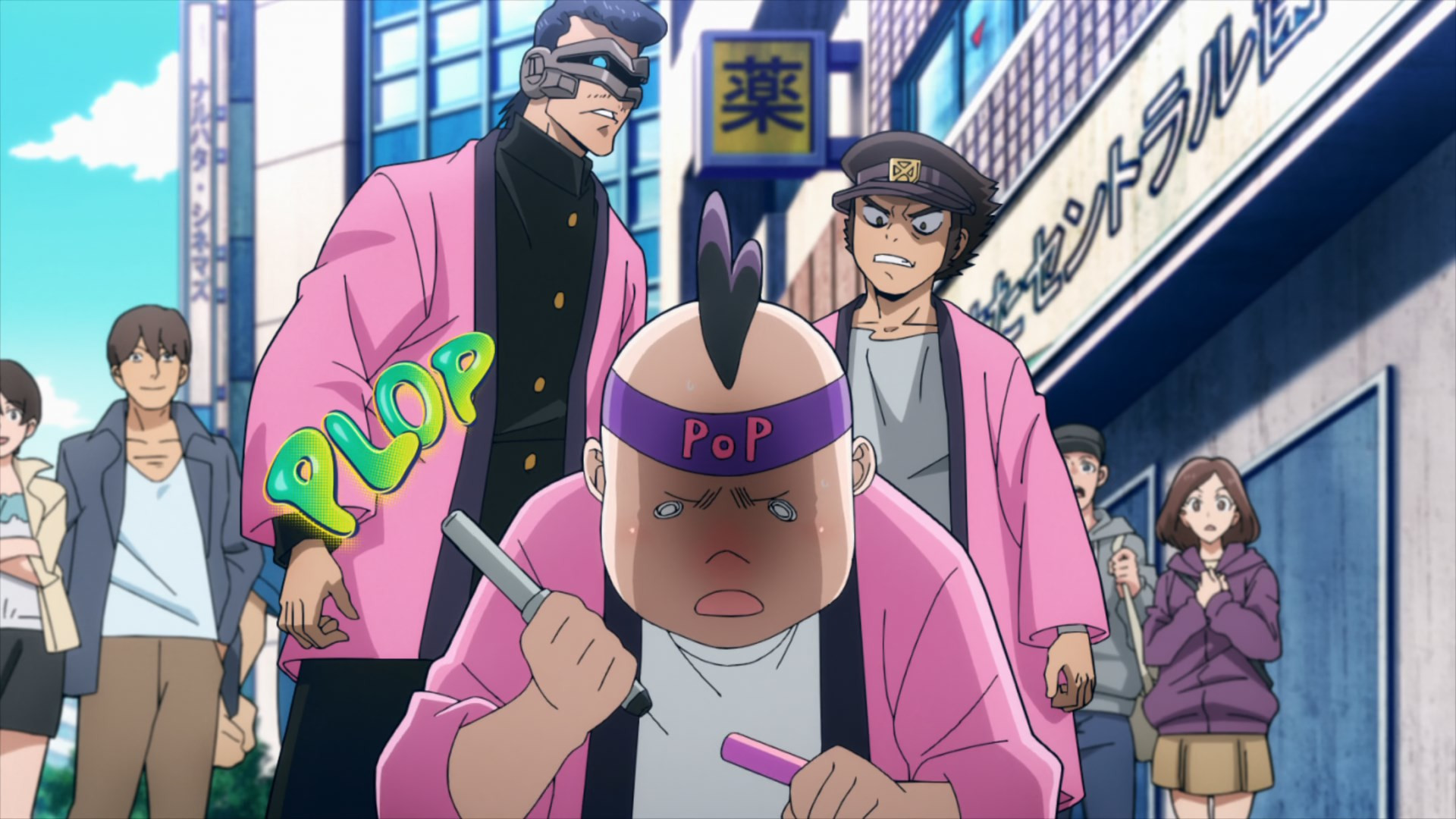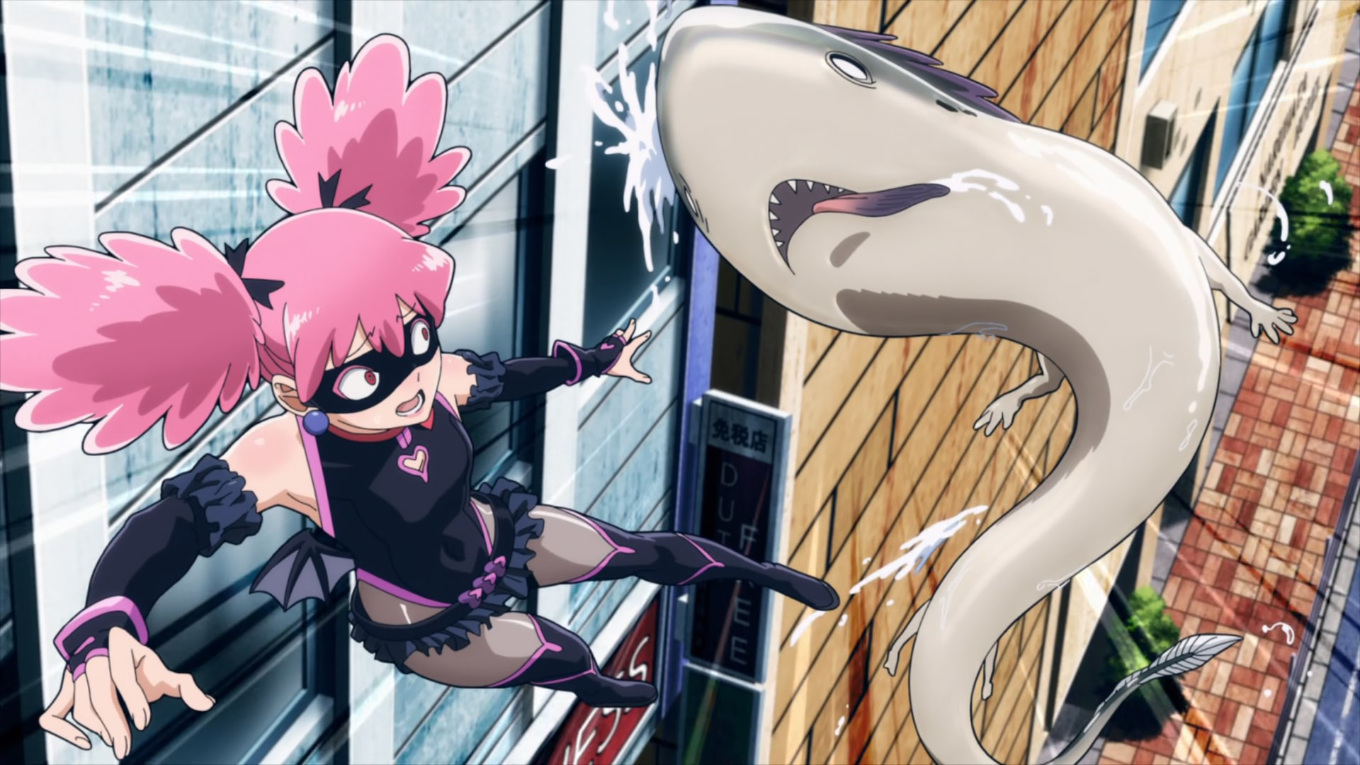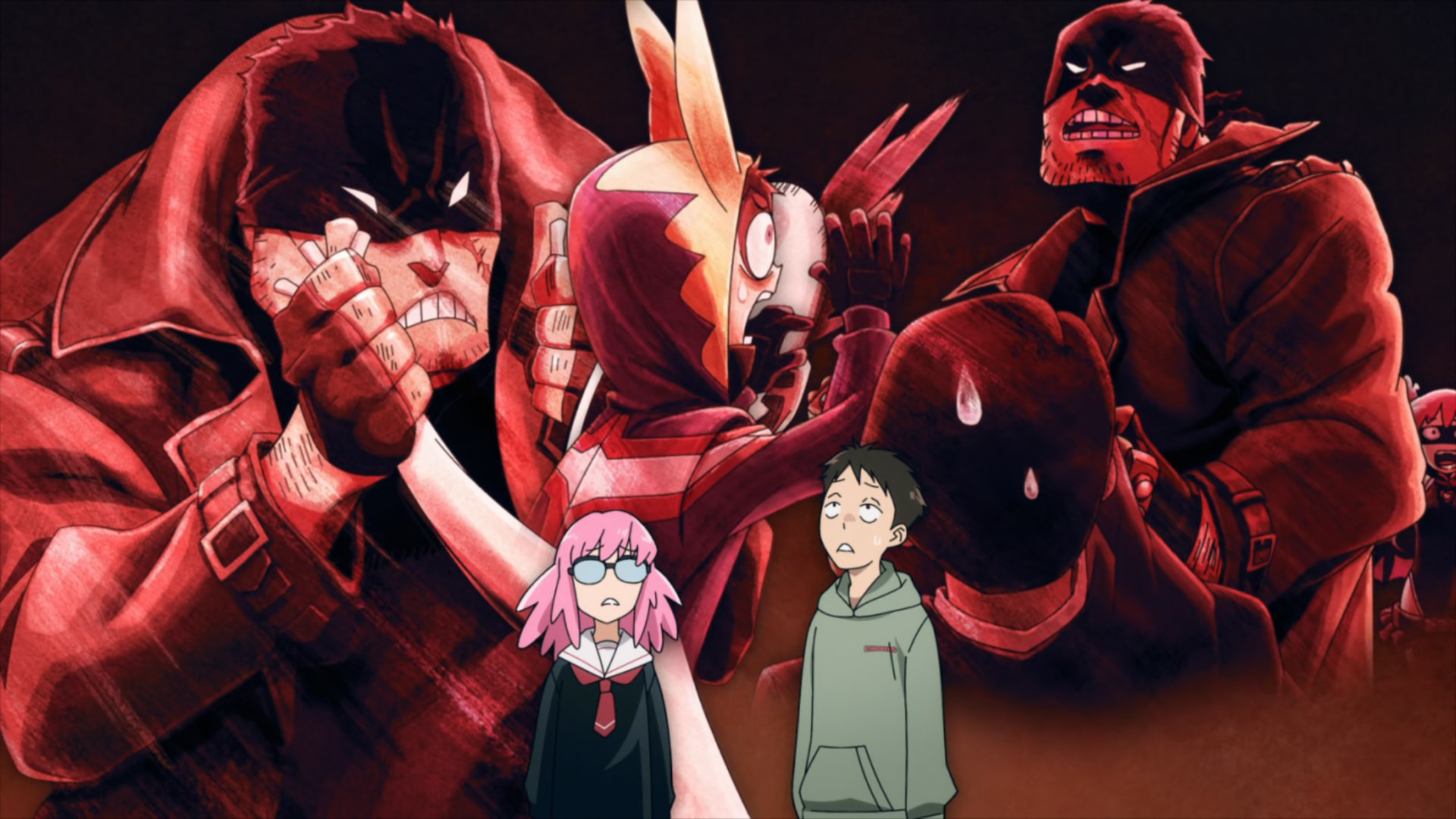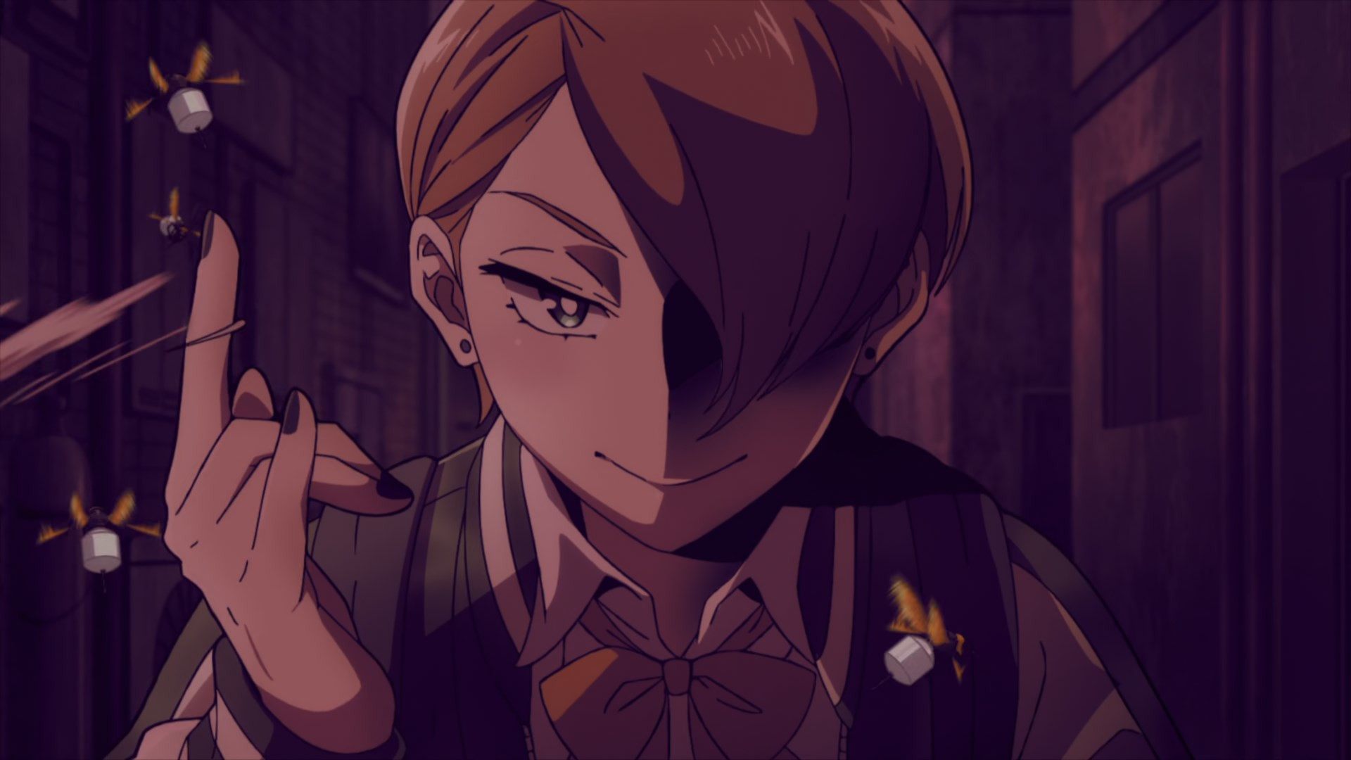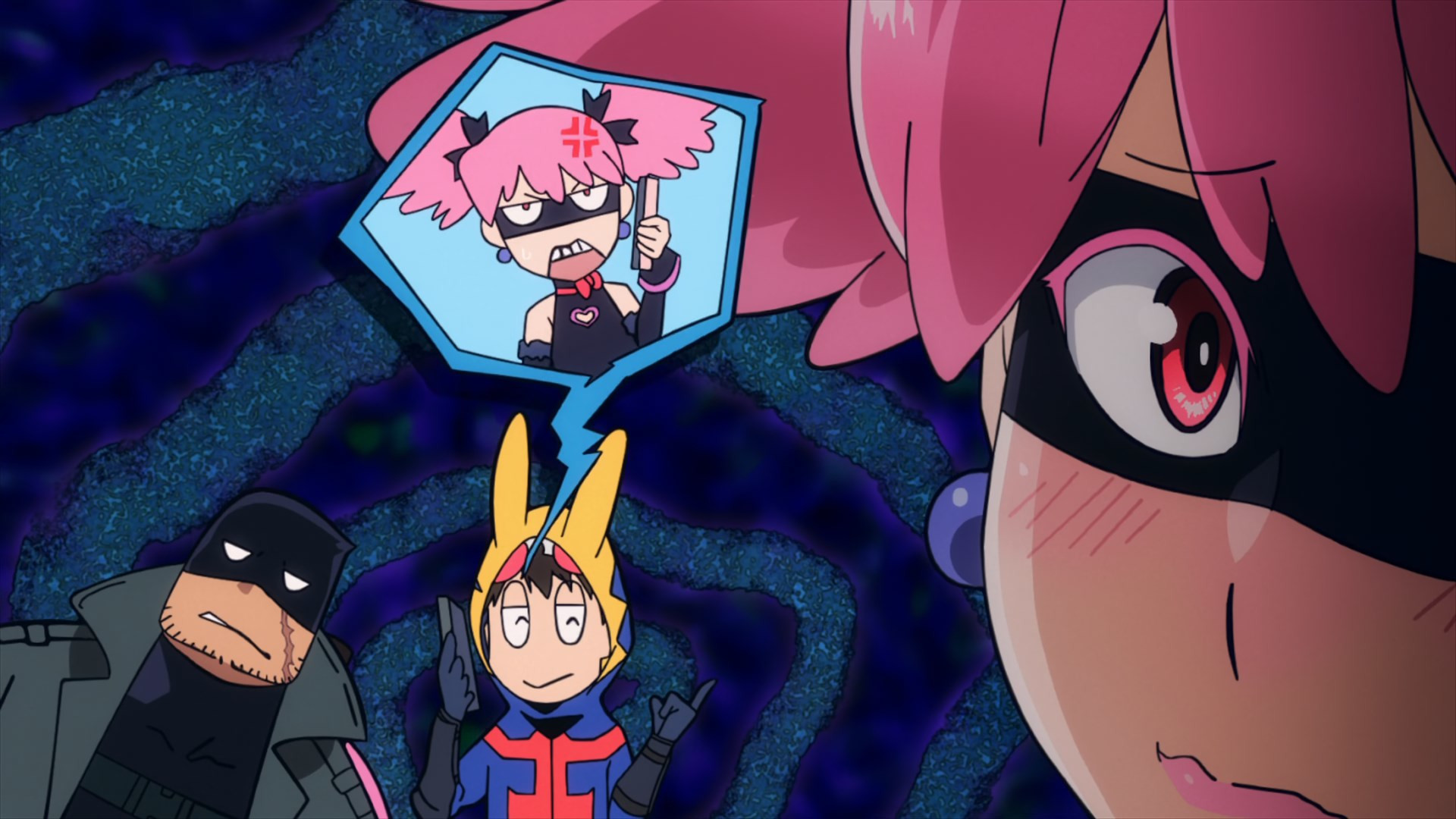Kouchi and the two middle-schoolers hatch a plan to see if Teru (released as a zaku by the cops) to tell her who his source is. They decide it’d be best not to bring “punch first, let the cops sort ’em out” Knuckleduster in on it. But the chaos prevents the plan from ever coming off, and Teru is seen in the company of another high school girl named Hachisuka Kuin (Senbongi Sayaka). We know a little about her – she’s a Pop fangirl, and describes herself (to herself) as a “part-time villain”. And she has an affinity for bees – bees intimately involved in the spread of Trigger, it seems.