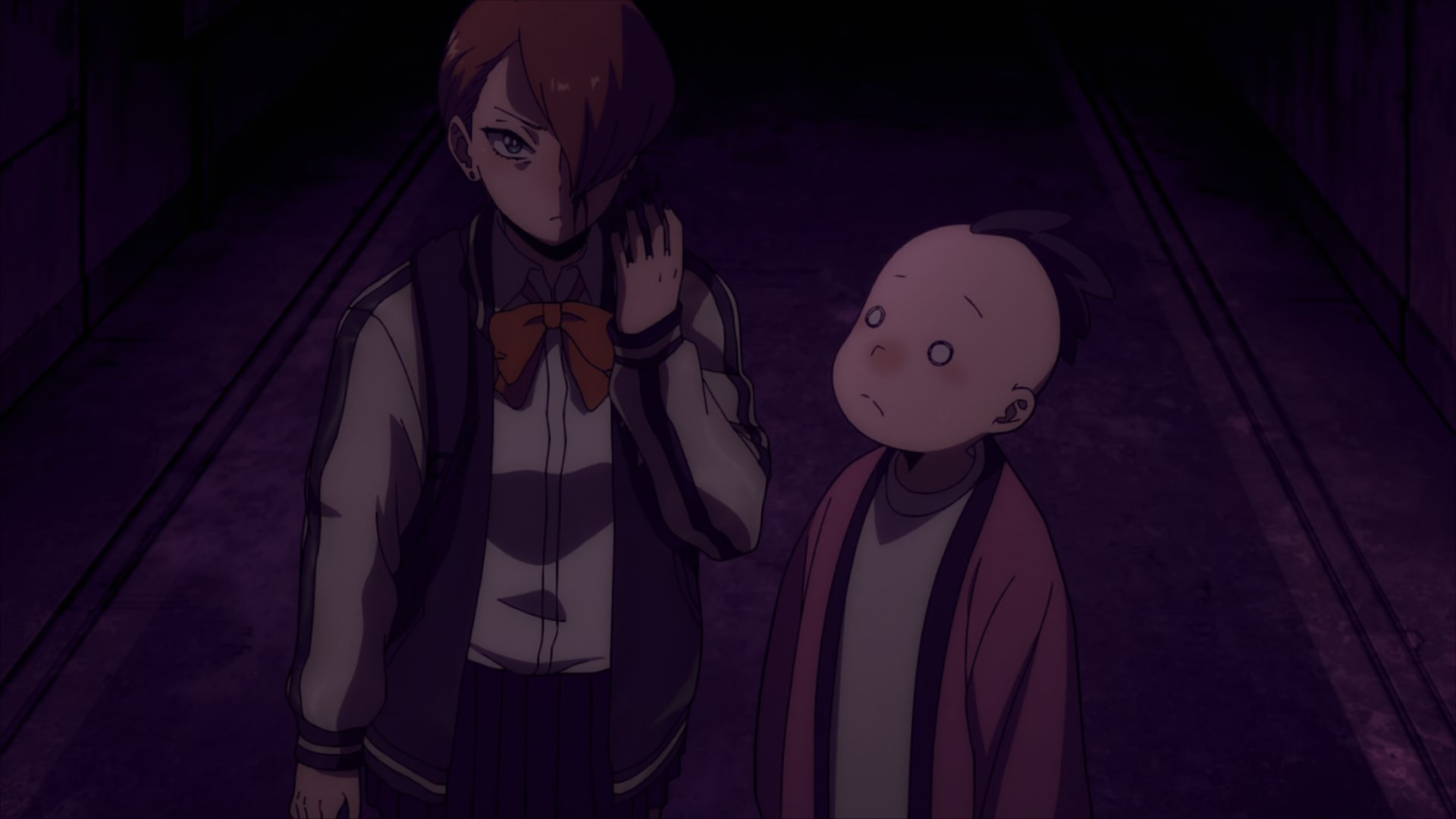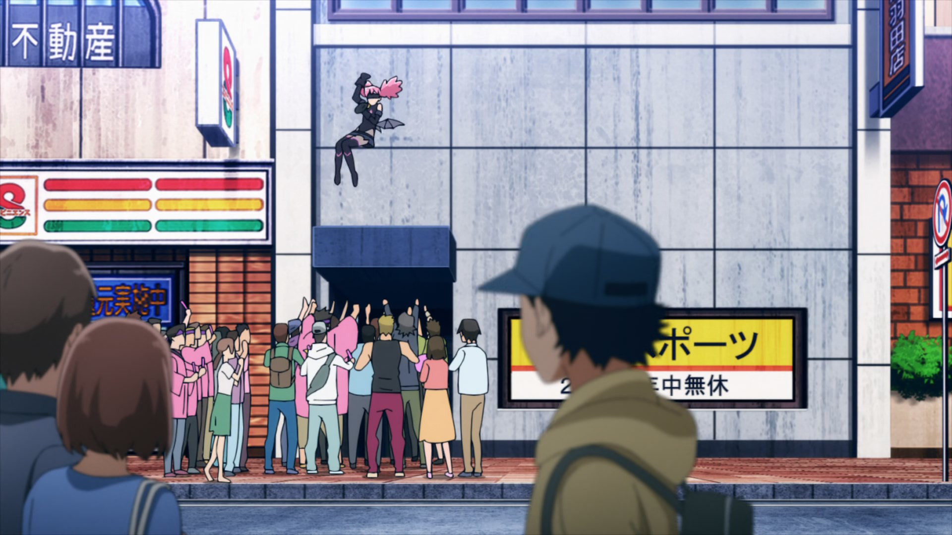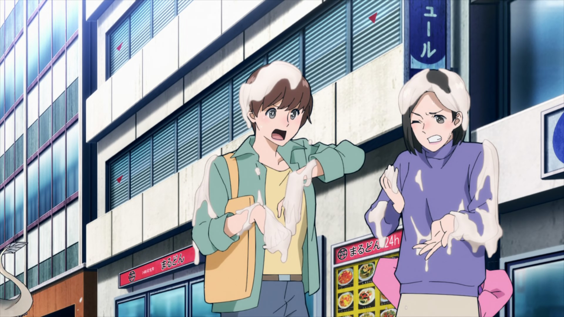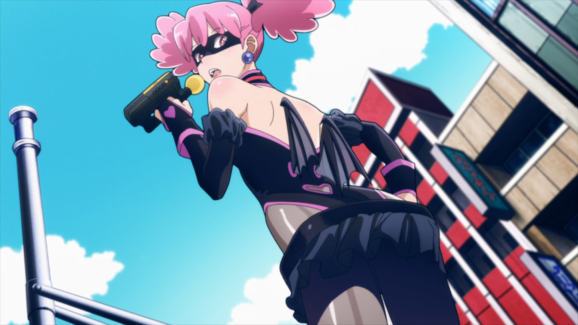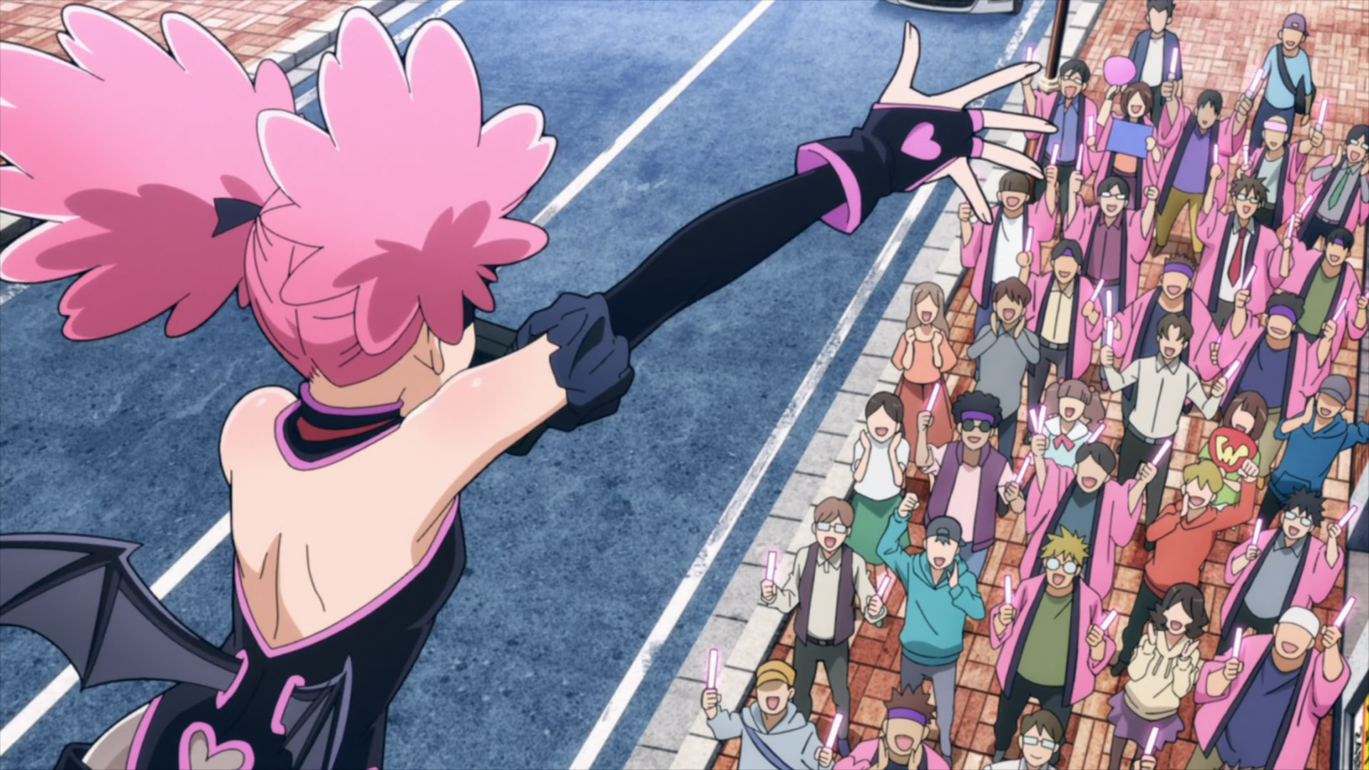 Kouchi and the two middle-schoolers hatch a plan to see if Teru (released as a zaku by the cops) to tell her who his source is. They decide it’d be best not to bring “punch first, let the cops sort ’em out” Knuckleduster in on it. But the chaos prevents the plan from ever coming off, and Teru is seen in the company of another high school girl named Hachisuka Kuin (Senbongi Sayaka). We know a little about her – she’s a Pop fangirl, and describes herself (to herself) as a “part-time villain”. And she has an affinity for bees – bees intimately involved in the spread of Trigger, it seems.