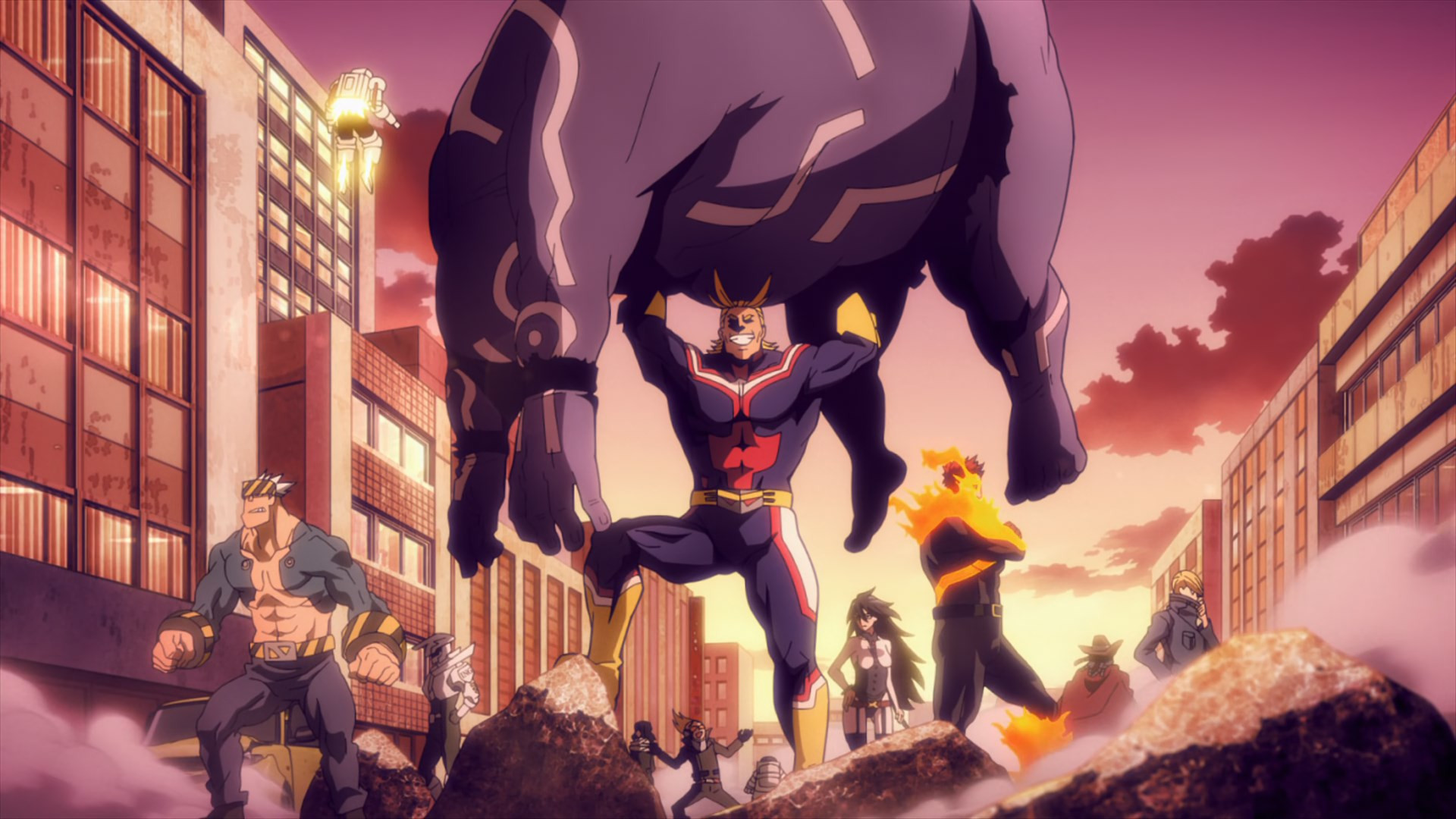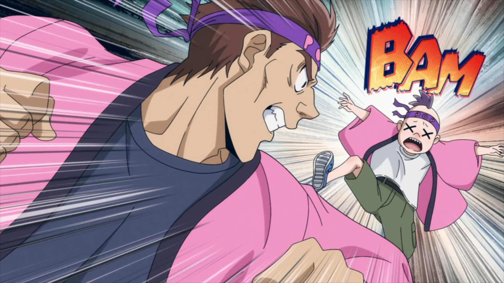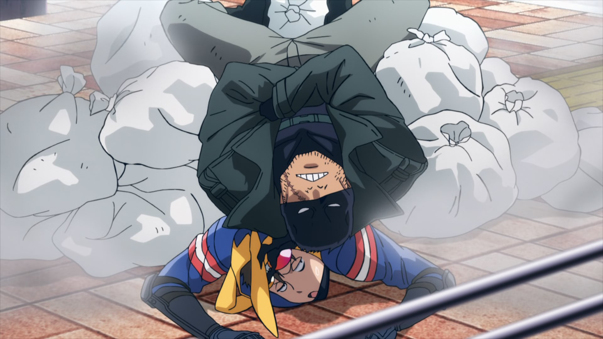 Even for these humble folks, however, duty is always one crisis away. The crisis in this case being another instant villain courtesy of Trigger. This time is a meek little fellow named Teru (Kamiki Kouichi), desperate to shake Pop’s hand. Tired of being pushed around by the toughs in the crowd, Teru pops some Trigger. And apparently his quirk is something in the eel vein, because he turns into a giant one. This gets uncomfortable for Pop very quickly, but fortunately Koucihi is in the area and Knuckleduster soon follows. That’s not to say fighting a giant eel is easy – they’re slimy bastards. But after a handshake proves insufficient to satisfy this one, Knuckle and The Crawler have to resort to udon flour to make Teru a little less hard to handle.