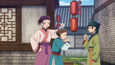 After a who knows how long journey, the girls end up in the boonies in- a hot spring town. Another unexpected development. I hope they let Mao Mao take a dip- hot springs would sure be one comfort amidst the stress of being kidnapped. It seems that this town is either the sisters’ home town or maybe a vacation home- one of the rich boys in the area knows them quite well. The impudent little brat (or little shit as Mao Mao refers to him lol) knows them quite well. Their visit is quite the surprise to him and he rushes to gather materials so they can celebrate in the upcoming festival. Shisui is quite the wildcard- she has kind side to her, from how she makes the kid thank the servant for her work, and she strikes me as a bit whimsical- she’s not someone I would have initially expected prior to last week to be involved as a spy and (presumably) co-conspirator in a nefarious plan. But that’s the point- it wouldn’t have gone off as well (for the conspirators) if she wasn’t.