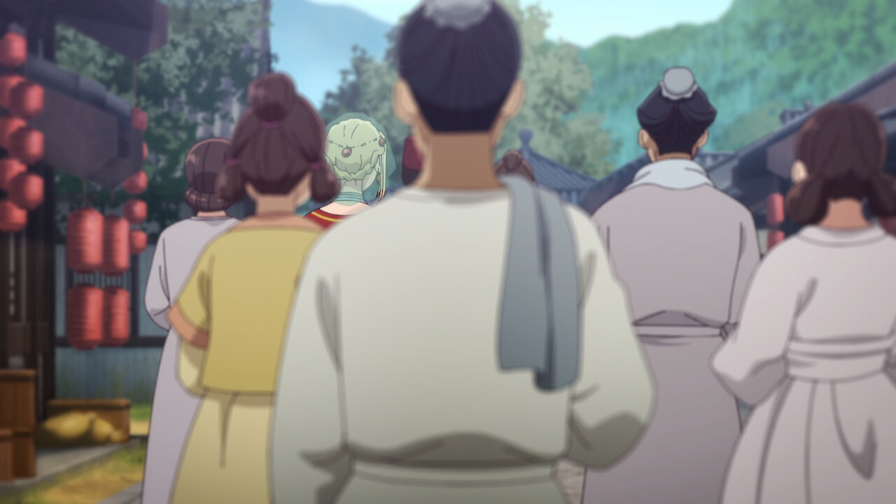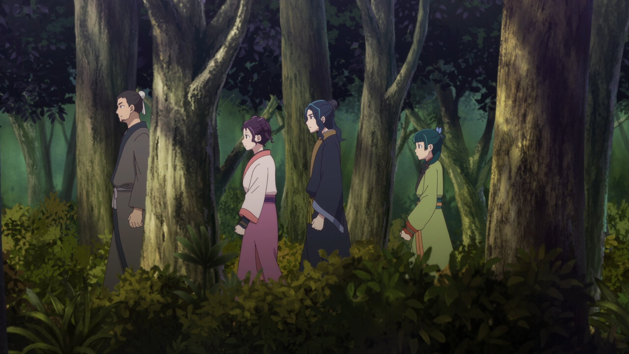 In order to save Shisui, Mao Mao begrudgingly goes along, where she and Shisui are disguised as villagers sold into slavery. A side note, but I found it interesting that her captors chose an outfit in Mao Mao’s signature green color scheme.