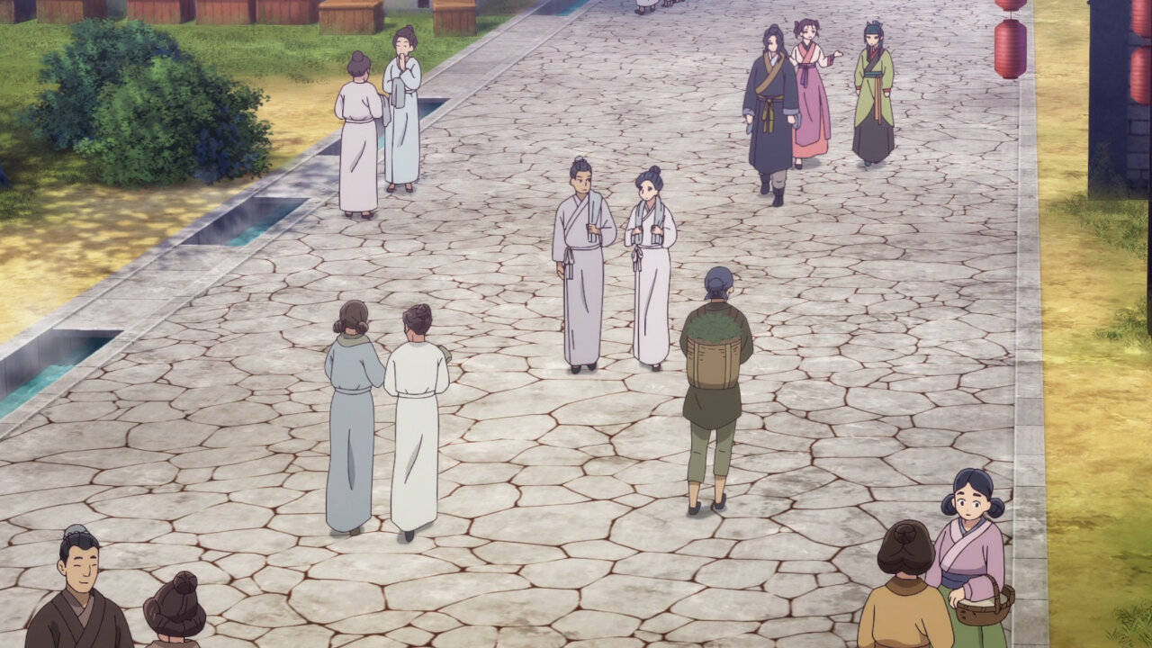 After a who knows how long journey, the girls end up in the boonies in- a hot spring town. Another unexpected development. I hope they let Mao Mao take a dip- hot springs would sure be one comfort amidst the stress of being kidnapped. It seems that this town is either the sisters’ home town or maybe a vacation home- one of the rich boys in the area knows them quite well. The impudent little brat (or little shit as Mao Mao refers to him lol) knows them quite well. Their visit is quite the surprise to him and he rushes to gather materials so they can celebrate in the upcoming festival. Shisui is quite the wildcard- she has kind side to her, from how she makes the kid thank the servant for her work, and she strikes me as a bit whimsical- she’s not someone I would have initially expected prior to last week to be involved as a spy and (presumably) co-conspirator in a nefarious plan. But that’s the point- it wouldn’t have gone off as well (for the conspirators) if she wasn’t.