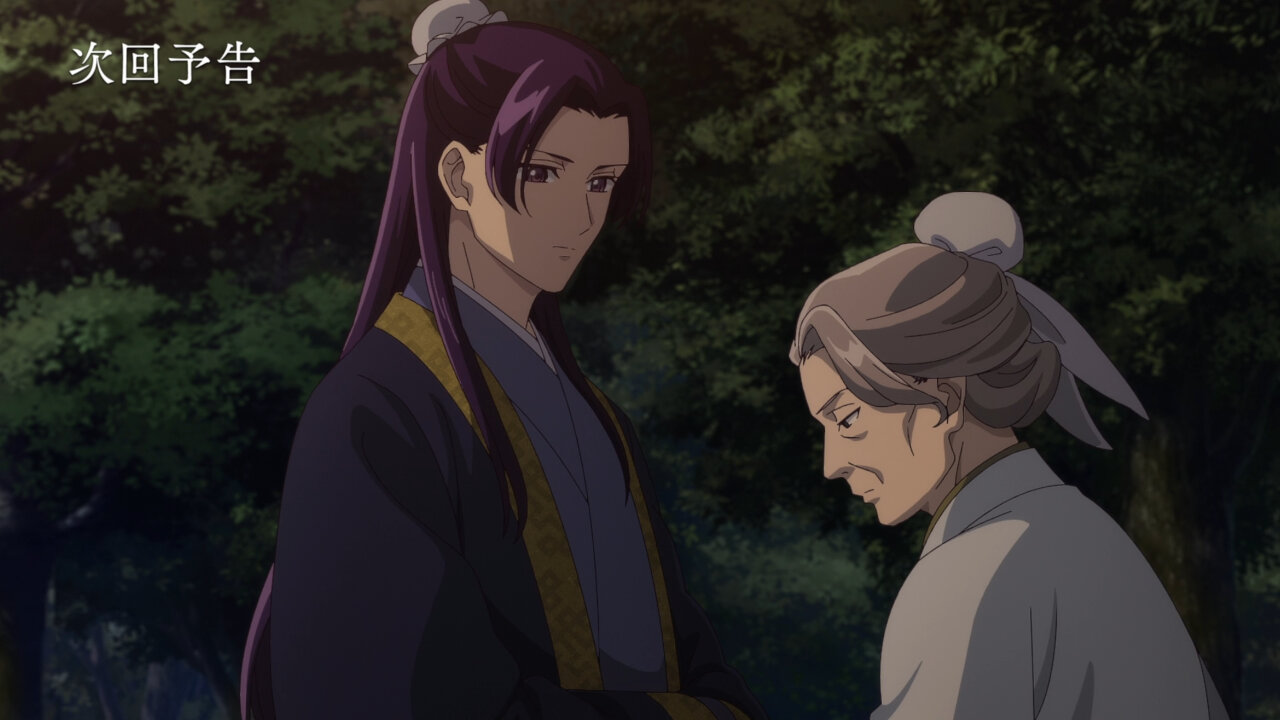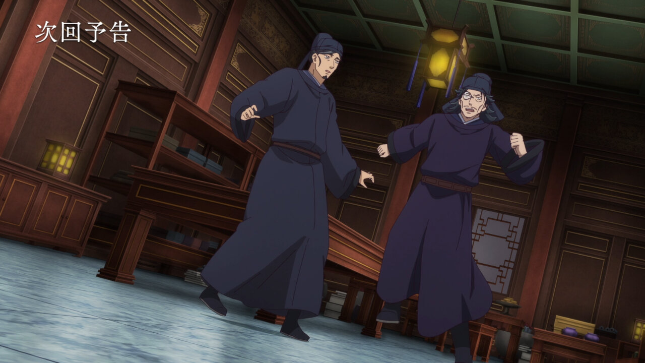I also find it curious (and stupid) for Suirei to kidnap Mao Mao- who she knows is Lakan’s daughter. Lakan cares too much about Mao Mao to ignore the situation when he eventually finds out (as it seems he will next episode). At the same time, he’s too intelligent to be drawn into a hostage situation that puts him at a disadvantage. No doubt, he’ll find some third path- and boy, I wouldn’t want to be on the receiving end of his anger. What is her purpose in this? Is it to draw out Jinshi? The Western emissary is also involved here- Mao Mao immediately notices the princess and the guards from the Moon Fairy incident. Which is immediately a concern, given the ties between Jinshi’s attempted assassination and the feifas that came from the West. Maybe Jinshi could show up as the moon fairy again, and order Mao Mao to be released, so aweing the princess that she demands Mao Mao be released… Probably not likely.