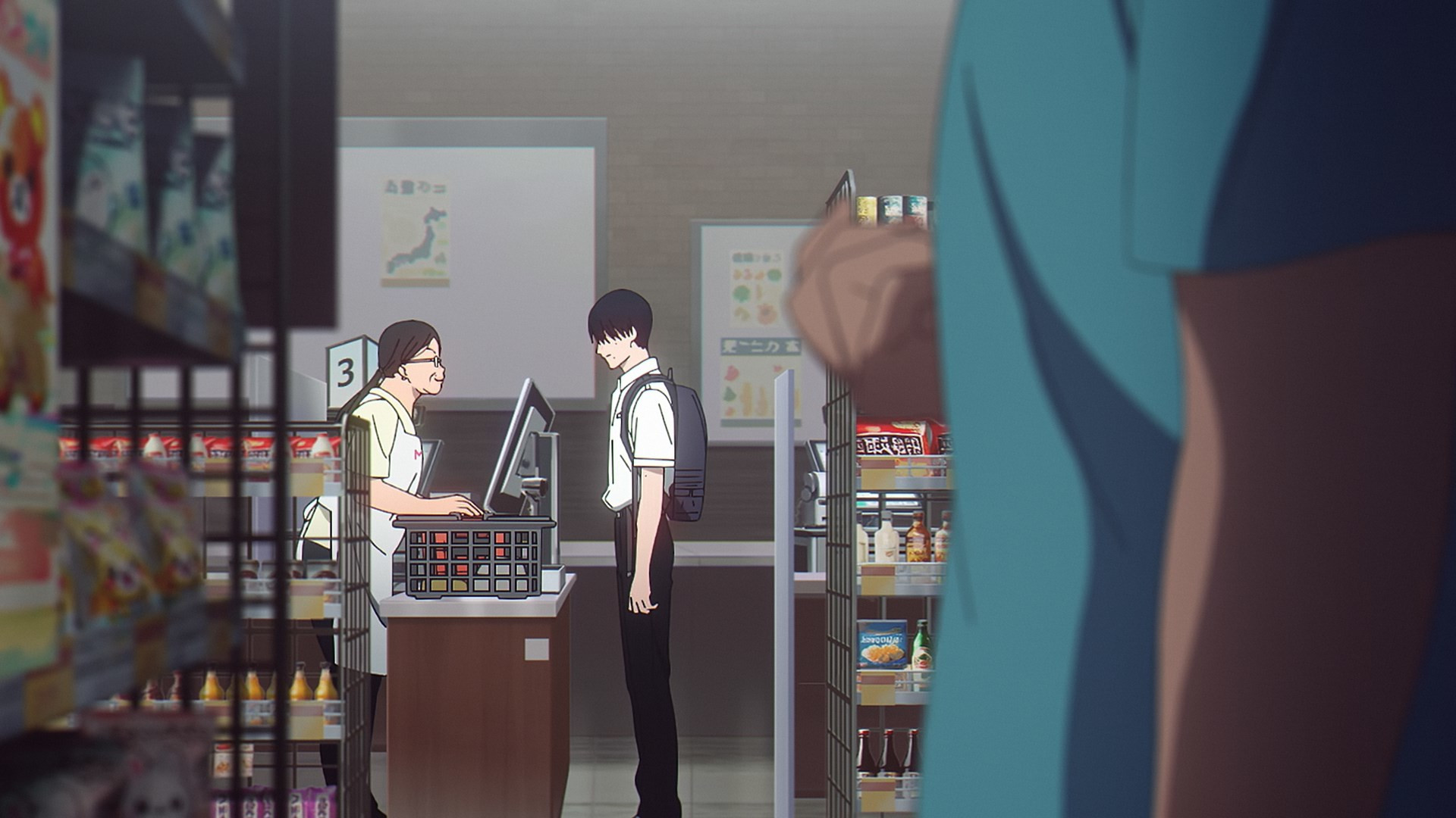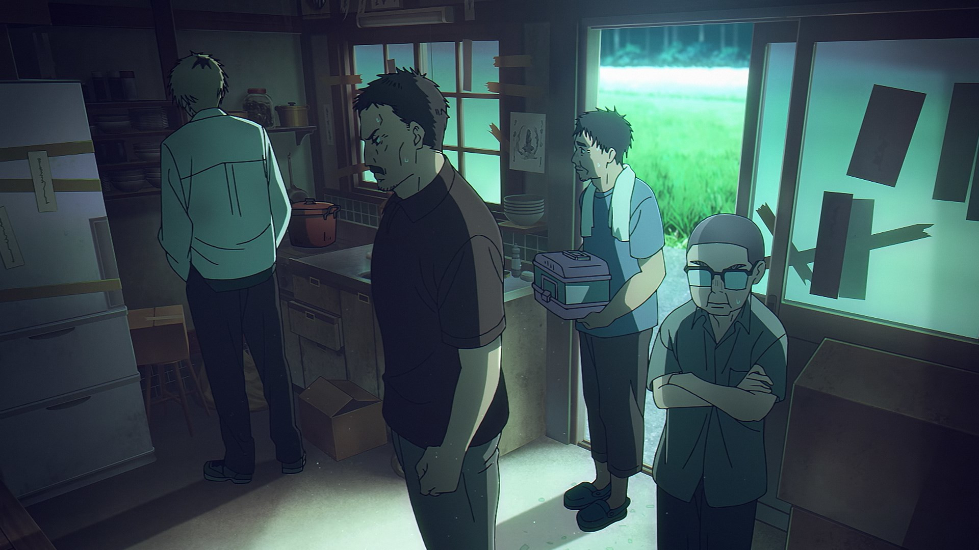 Finally, we meet Kurebayashi Rie (Kowaka Wakana). She’s probably my favorite among the supporting cast, and she’s already picked up on something being amiss with Yoshiki. Kurebayashi-san has BME (Big Mom Energy) to spare, and she takes the initiative to approach Yoshiki outside the grocery store (after an oppressive encounter with the busybody cashier). She’s just a normal housewife, she says, who senses things other people don’t. She tells Yoshiki something awful was on the mountain where Hikaru disappeared, and suddenly disappeared (which scares her more). More pointedly she warns him to stop what he’s doing or he’ll wind up “mixed”. Kurebayashi gives Yoshiki her LINE info and entreats him to call her when he’s ready to talk about what’s happening to him.